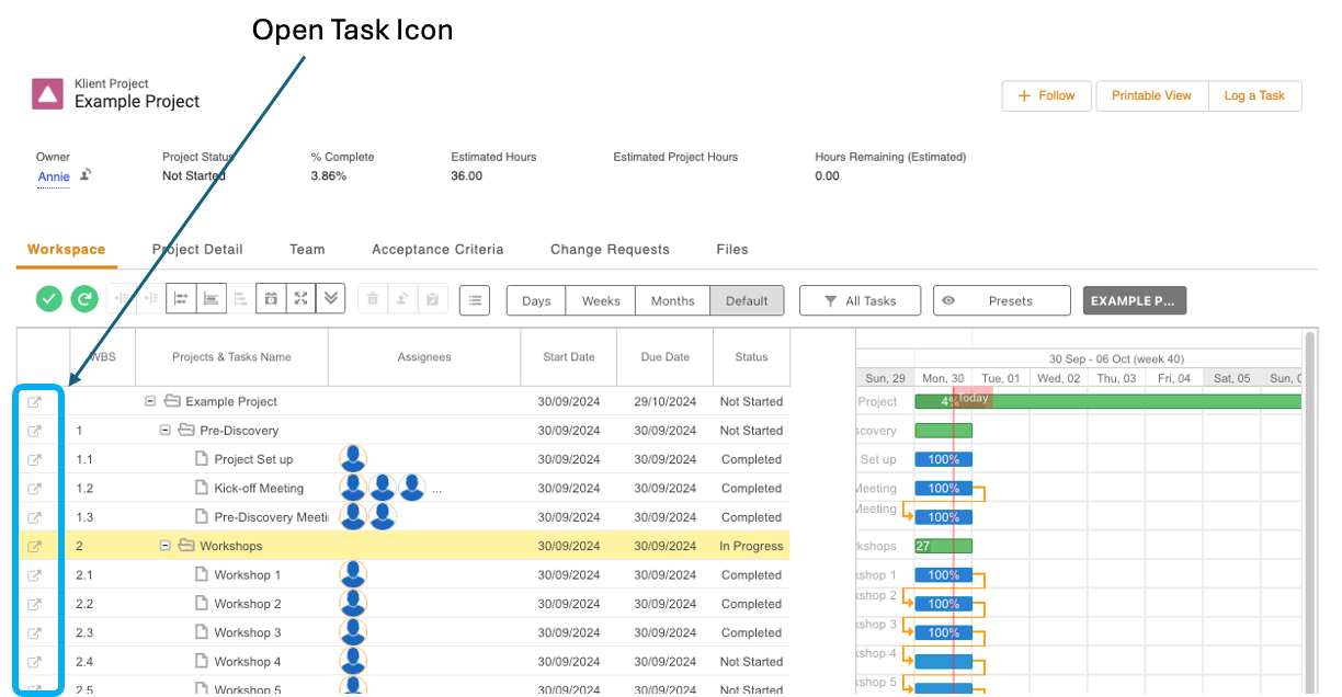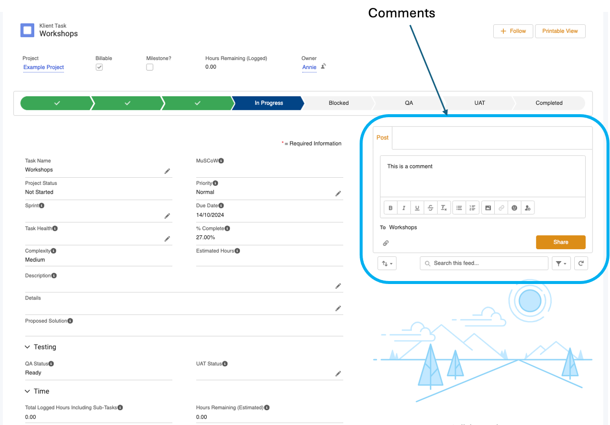The Task page provides information about a selected task e.g., number of hours logged, number of hours remaining, task status, QA and UAT information.