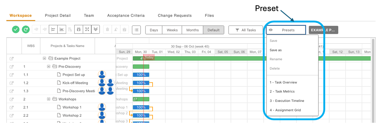 Presets can be used to save the selected; View, Duration and/or Filter options. Use the ‘Save as’ feature to save the preset.