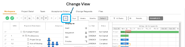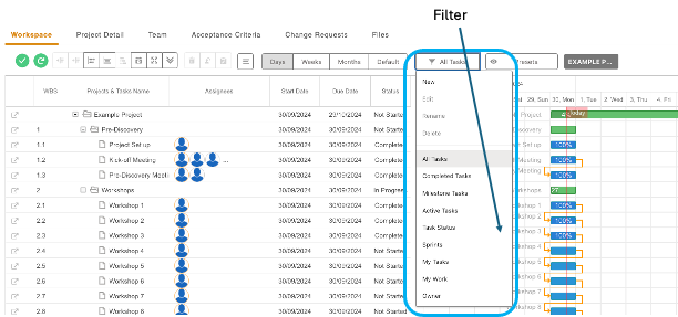 The workspace shows a list of tasks and sub-tasks as well as associated dates and a status.